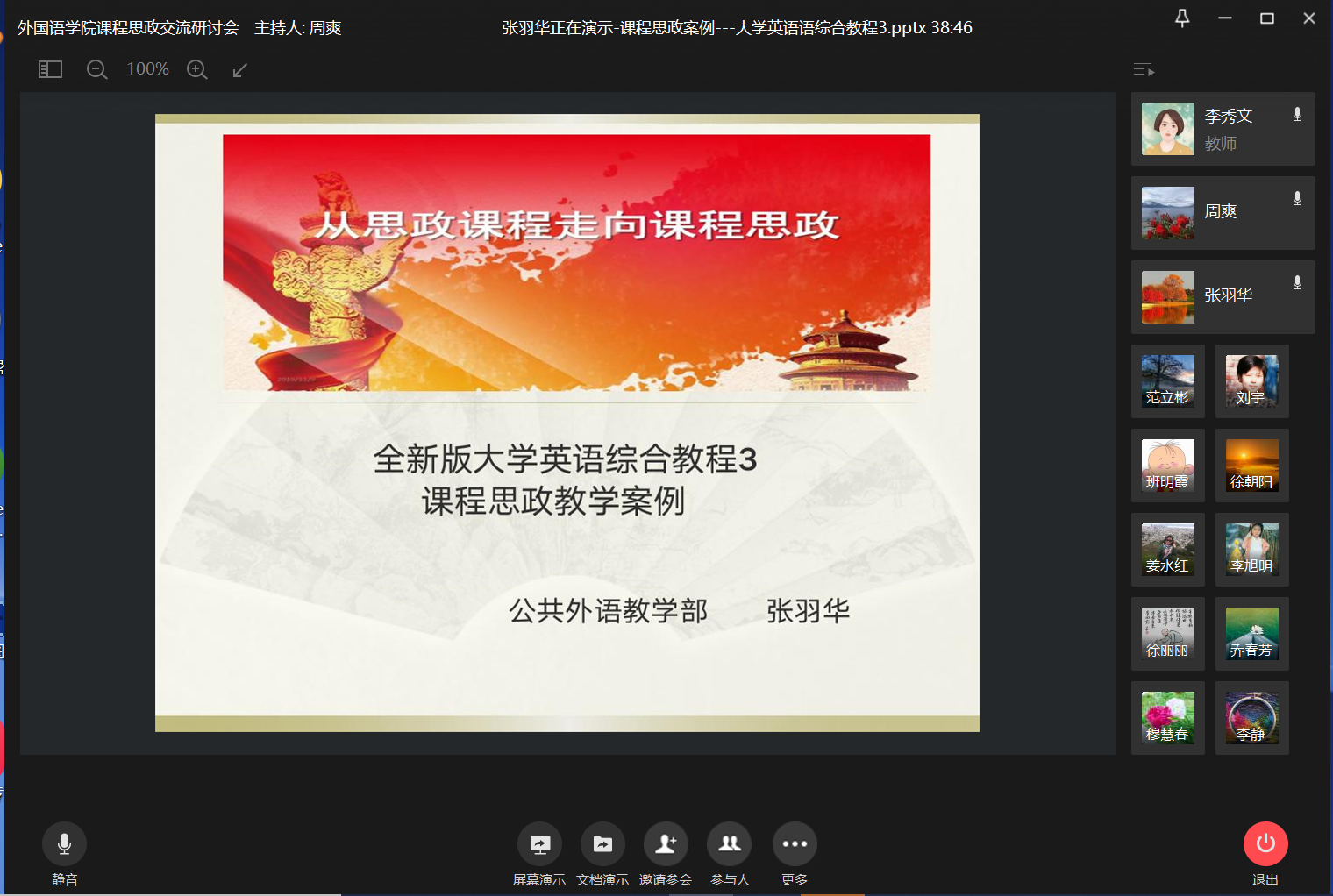 研讨会中,各专业推选的8个课程思政案例参加学院展示,分别是孙莉老师的《全新版大学英语综合教程课程思政案例设计》、张羽华老师的《全新版大学英语综合教程3课程思政教学案例》、李秀文老师的《新视野大学英语课程思政案例设计》、姜水红老师的《托福课程思政案例设计》、赵艳宇老师的《英语国家社会与文化-课程思政教学案例》、李笑老师的《英语阅读3-课程思政教学案例》、宋卓时老师的《日本概况-课程思政设计》、龙慧星老师的《基础日语1-课程思政教学案例》等8个优秀案例。