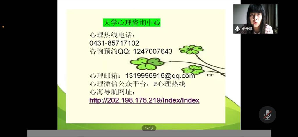 讲座邀请学校大学生心理健康教育与咨询中心崔元慧老师主讲。崔老师由浅入深,从同学们对“心”的理解的讨论中引出此次讲座的主题“美好的大学生活,从‘心’开始”,带领大家解读了“什么是心理健康?”、“心理健康的重要性”、“如何区分心理是否健康”以及“如何对待不健康心理”四方面内容。随后又通过趣味测验与同学们进行了互动和交流,并对新生进行了一个初步的心理健康状况的评估。此外,崔老师还向同学们提供了大学心理咨询中心的联系方式,呼吁大家要及时关注个人心理健康,直视心理问题,保持乐观积极的生活态度。