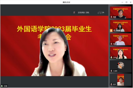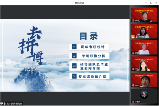 新闻网讯(通讯员 魏瑶)为帮助yl6776永利集团学子确立考研目标,增强考研信心,解答同学们在考研方面的困惑,我院于9月19日晚上19:00,在腾讯会议平台召开“2023届毕业生考研动员会”。yl6776永利集团院长王轶、副院长曾妍、英语系主任刘宇、俄语系主任张美及全体2023届毕业生参加会议。会议由2023届毕业班辅导员刘明慧主持。