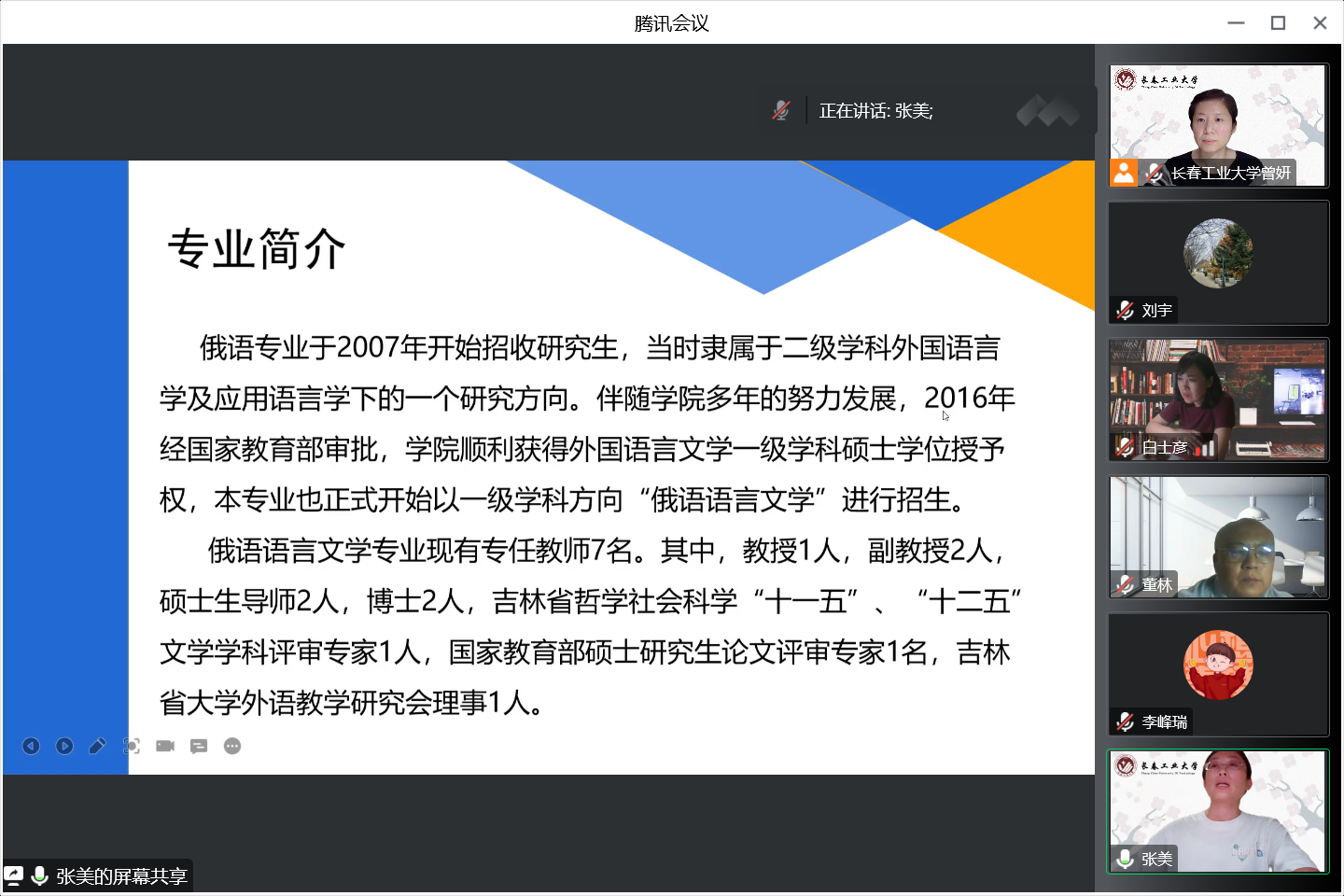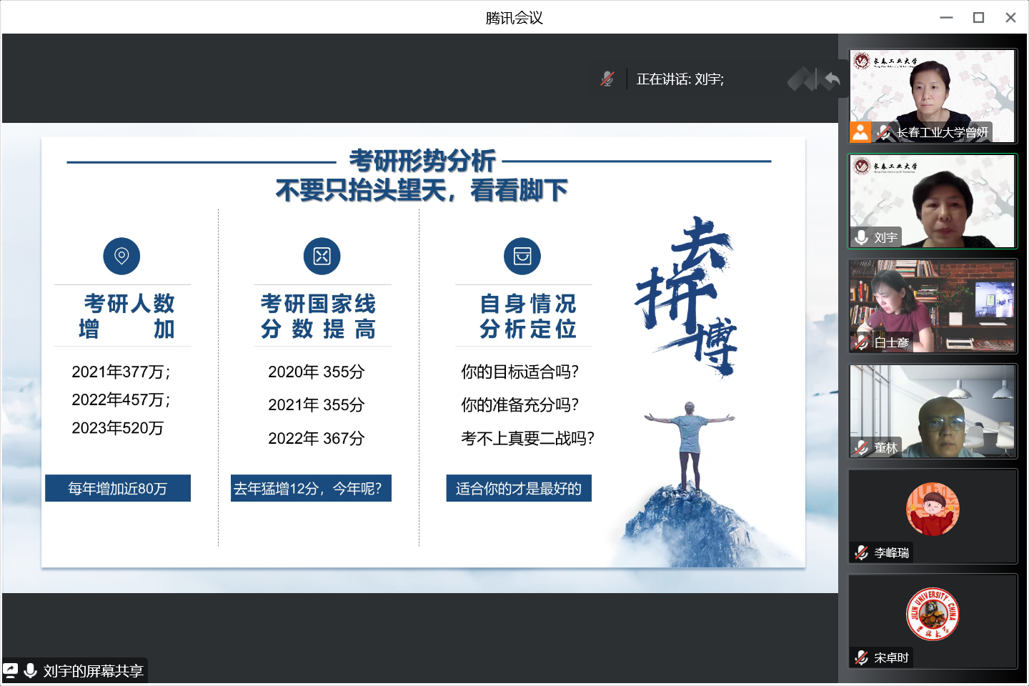 新闻网讯(通讯员 宋卓时) 为提升学生考研热情和积极性,帮助学生了解2023年的考研形势,明确考研目标,9月30日晚7点,yl6776永利集团副院长曾妍、英语系主任刘宇和俄语系主任张美,在腾讯会议平台,为长春人文学院yl6776永利集团的学生召开了线上考研宣讲会。该校yl6776永利集团副院长白士彦主持会议,翻译系主任孙瑜、应用日语系副主任董林、经贸俄语系主任冯柱及19、20级学生参加了本次宣讲会。