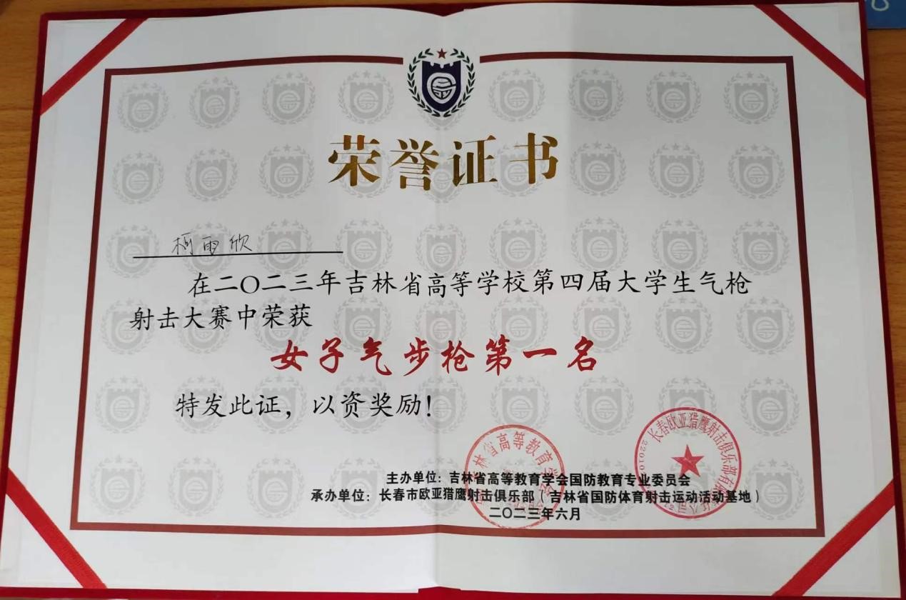 (通讯员 张晓君 柯雨欣 魏瑶)为进一步落实立德树人根本任务,增强学生国家安全意识,培养学生国防素质观念。吉林省高等教育学会国防教育专业委员会于6月10日主办吉林省高等学校第四届大学生气枪射击大赛。我院柯雨欣同学参加本次比赛并取得女子气步枪第一名和女子气手枪第三名的好成绩。