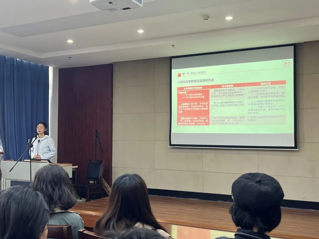 许翠婷老师分别从新生入学适应、大学生学习心理、大学生人际交往、心理咨询四个方面,结合各种现实的案例,为新生提供可操作性的建议,引导学生正确认识自我,欣然接纳自我。克服偏见,有效沟通,打造宿舍第二温馨小家庭;有效管理时间,主动规划生涯;内化学习动机,学会如何学习;学会管理情绪,锻造一颗坚强的心。许翠婷老师详细地向新生讲解了心理咨询的常见误区,帮助新生对心理问题和心理咨询树立科学的观念,引导新生学会心理求助。