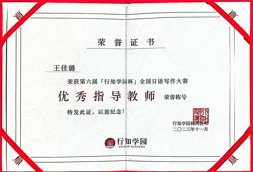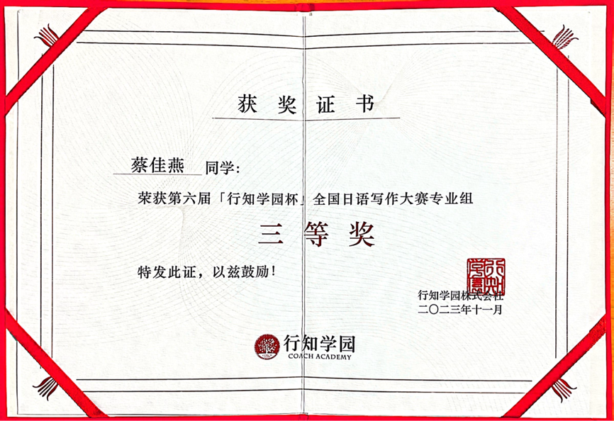 在此次写作大赛中,我院日语专业学生蔡佳燕的作品从全国158所学校的1186篇征文中脱颖而出,荣获“专业组三等奖”的佳绩。其指导教师王佳璐老师荣获“优秀指导教师奖”。