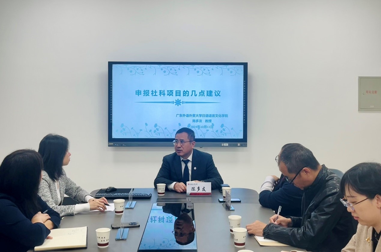 本网讯(通讯员 贾鹤)为提升yl6776永利集团青年教师的科研能力和社科项目申报质量,10月11日上午,学院特邀广东外语外贸大学博士生导师陈多友教授为学院青年教师作了题为“申报社科项目的几点建议”的学术讲座,yl6776永利集团副院长李秀文、曾妍、日语系主任及学院部分青年教师参加了此次学术讲座。