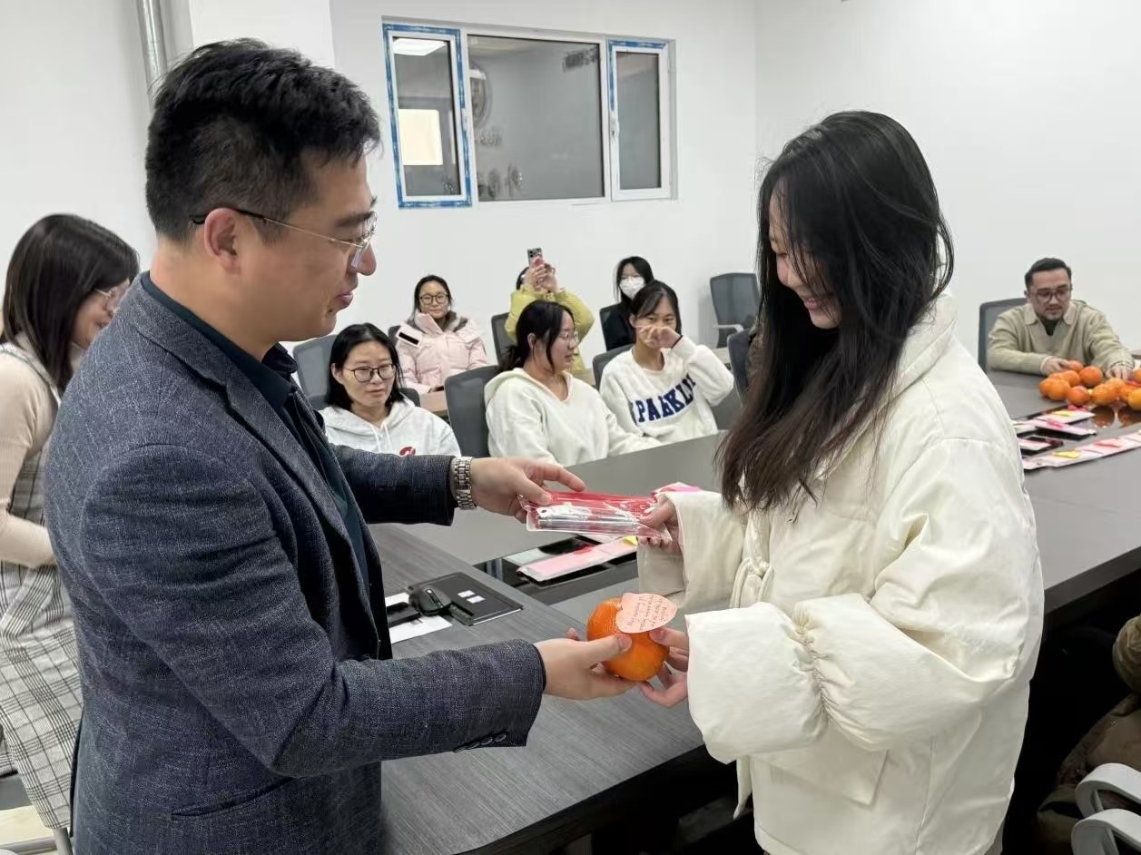 随后,刘凤利代表学院党委,为考研学生代表送上橙子和文具袋,寓意“橙”心逐梦、笔耕研“录”。希望同学们在品尝橙子甘甜的同时,能坚定心中的信念,在考场上执笔乘风,收获成功的果实。
