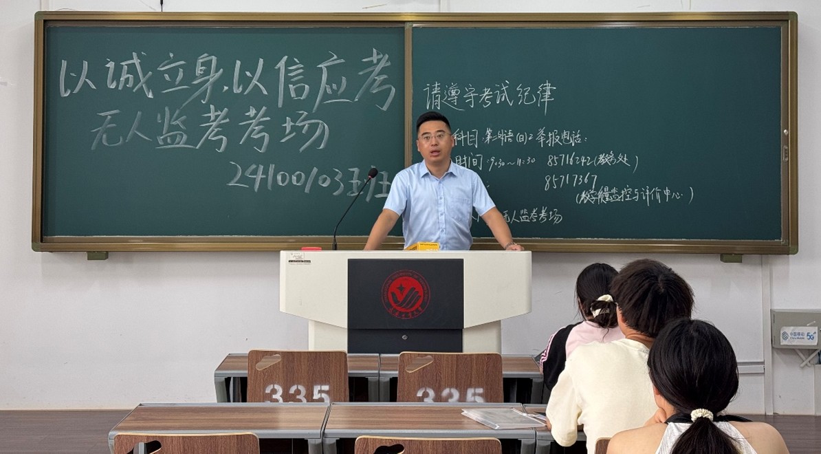 考试正式开始前,学院党委副书记刘凤利老师到考场进行考前动员。他在动员讲话中指出,学院在24100103班采取“无人监考”考试模式进行考试,源于对同学们的充分信任,不仅是对同学们学习成果的检验,更是对个人诚信品质和自我管理能力的重要考验。希望大家能将日常班级建设中形成的诚信共识转化为实际行动,以高度的责任感和自律意识,维护考场秩序,用真实成绩展现学习成果,书写无愧于心的诚信答卷。