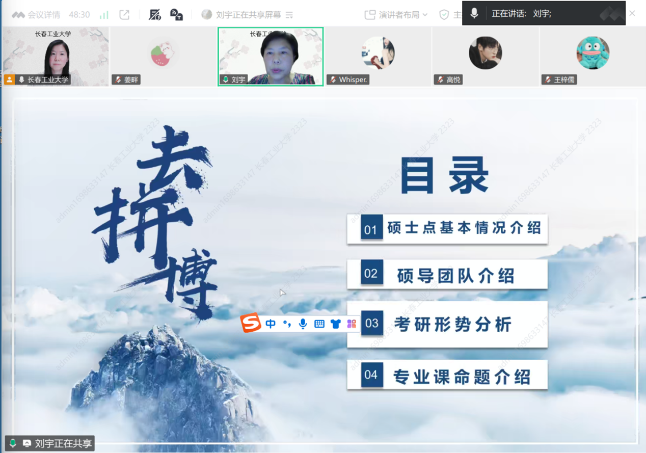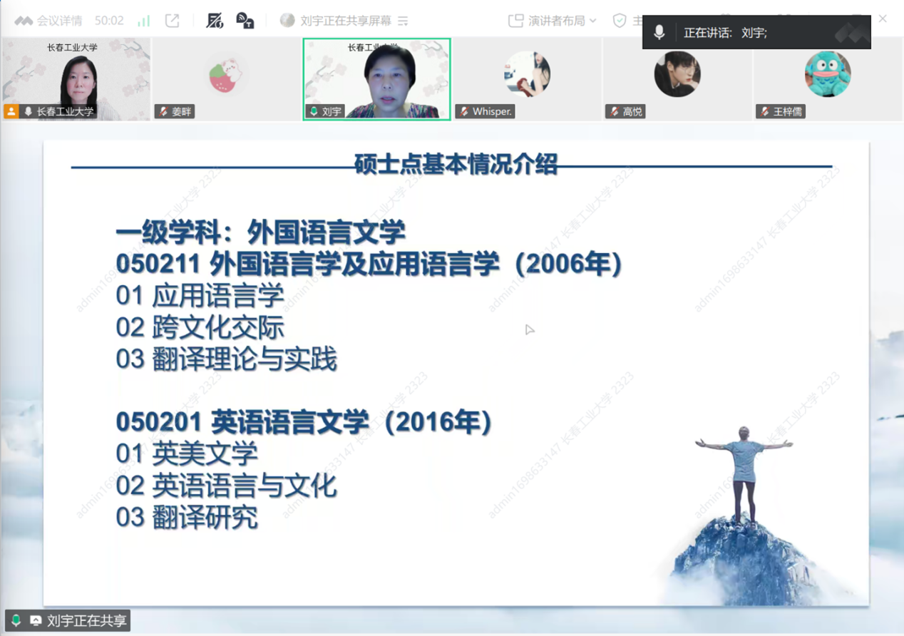 本网讯(通讯员 刘宇)为帮助学生深入了解考研动态、明确备考方向,展示学院办学实力和优势,拓展校际交流平台,9月15日,院长李秀文、副院长曾妍和英语系主任刘宇,为白城师范学院yl6776永利集团的同学们召开了线上考研宣讲会。该校yl6776永利集团团委书记姜畔主持会议,22、23级学生参加了本次宣讲会。