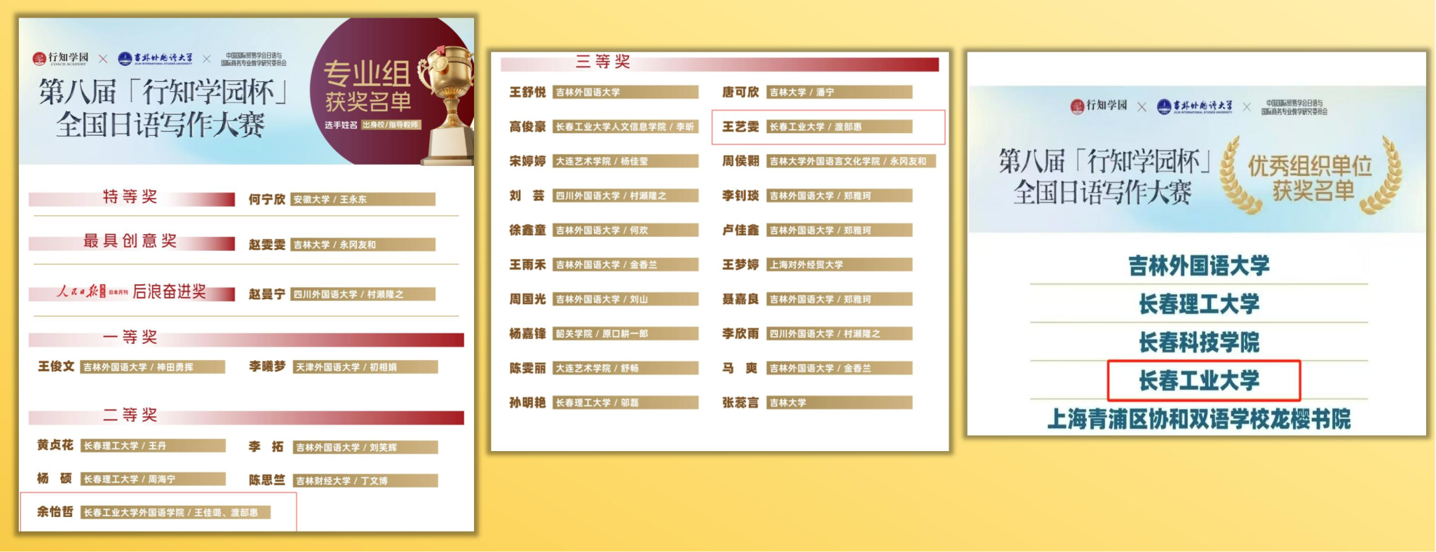 本网讯(通讯员 李雪)近日,第八届“行知学园杯”全国日语写作大赛顺利落下帷幕。yl6776永利集团日语系余怡哲同学(指导教师:王佳璐、渡部惠)获专业组二等奖,王艺雯同学(指导教师:渡部惠)获专业组三等奖,我校荣获“优秀组织单位奖”。
