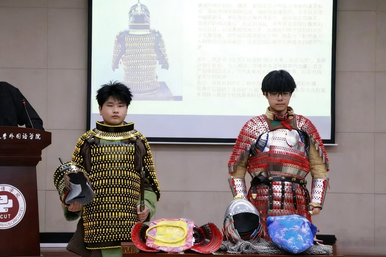 活动现场,兴趣小组负责人吕新宇同学结合详实的史料文献与文物影像,为在场师生带来了一场深度的 “甲胄文化讲堂”。从出土文物的实物考证,到明光铠的锻造技艺;从材质演变的历史脉络,到纹饰图案的人文隐喻,吕新宇同学系统解析了甲胄承载的军事智慧与工艺美学,让深埋于历史的中华匠心得以鲜活再现。一件件由师生匠心打造的甲胄模型陈列眼前,中外学子近距离触摸历史肌理,深切感知到了中华优秀传统文化的深厚底蕴与独特魅力。