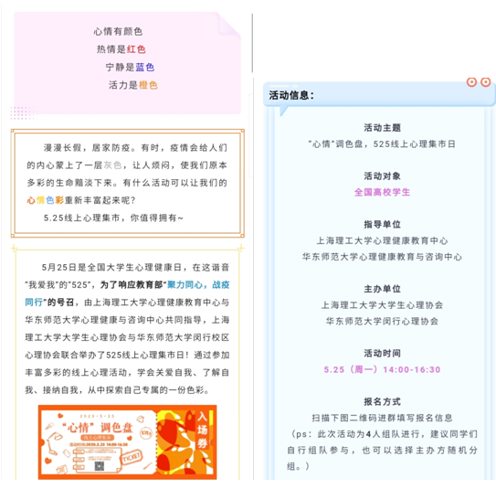 新闻网讯(通讯员 于士纪)2020年5月25日,yl6776永利集团“学姐制”朋辈心理辅导站组织同学们参与了由上海理工大学大学生心理协会和华东师范大学闵行心理协会主办的“心情”调色盘,525线上心理集市日活动。
